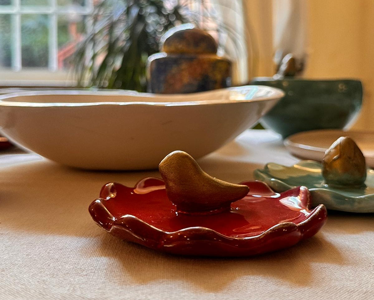 Ogni pezzo è realizzato interamente a mano e decorato con engobbi e smalti formulati da noi. La smaltatura è il risultato di un equilibrio tra chimica e sperimentazione, per dare vita a opere capaci di emozionare attraverso la magia dei colori.
